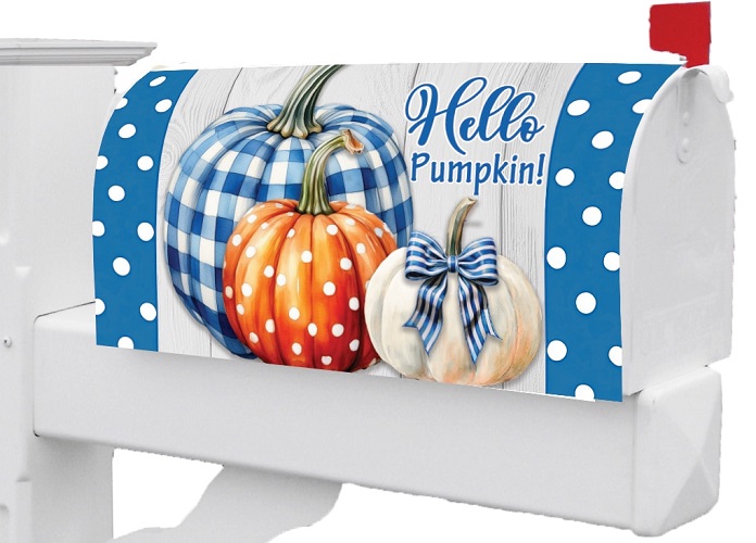 Gingham Pumpkin Stack mailbox cover is a decorative magnetic mailbox cover by Custom Décor. Used to personalize mailboxes with colorful artistic designs. Magnetic mailbox covers provide artistic images for every season and holiday. Manufactured in the USA using the finest materials and UV-printing process. Therefore, ensuring bright vivid colors and exceptional outdoor durability. Mailbox covers drape over the top of the mailbox & hold in place by strong magnetic strips. Above all, Mailwraps easily install and can be easily changed all year long. Garden House Flags offers the comprehensive collection of Custom Décor Mailbox Makeovers.